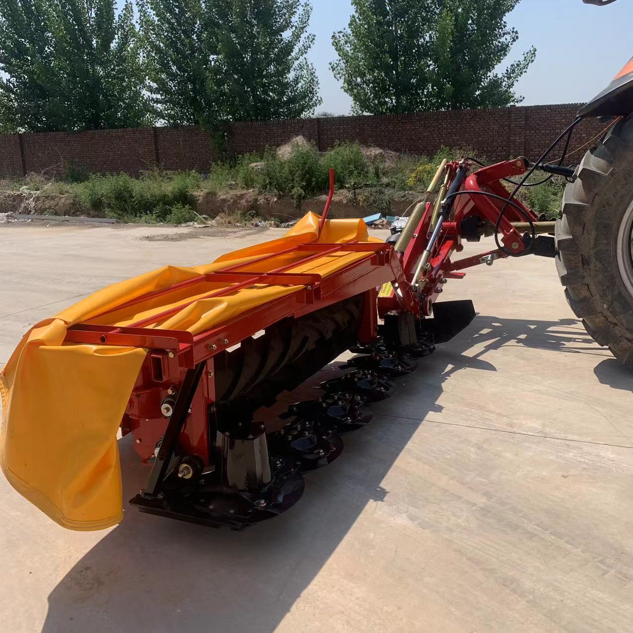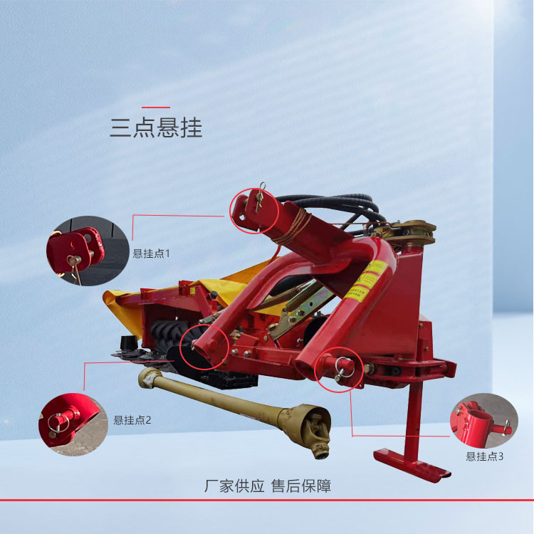 - 结构特点:采用三点悬挂方式与拖拉机连接,安装和拆卸方便。其圆盘割草装置旋转速度可达 3000 转 / 分钟,能有效扶起倾斜的草,便于收割倒伏的牧草。配备橡胶压扁辊,可将割下的新鲜草茎压扁,加速水分蒸发,使茎、叶、花干燥一致,减少营养损失。